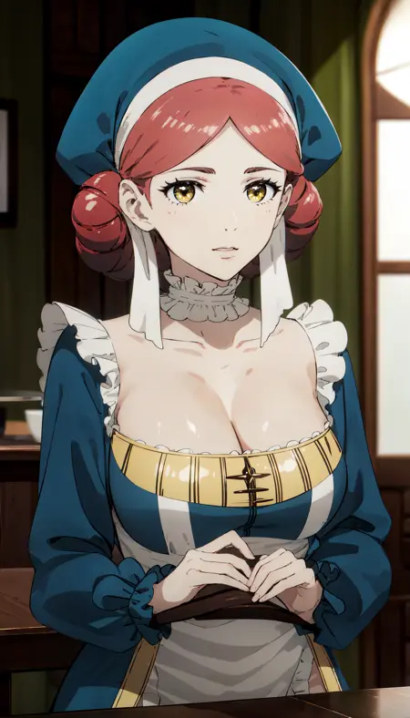red hair, hair buns, yellow eyes, blue dress, long dress, blue sleeves, frilled choker, blue hat, white apron, yellow chest trim, blue top,