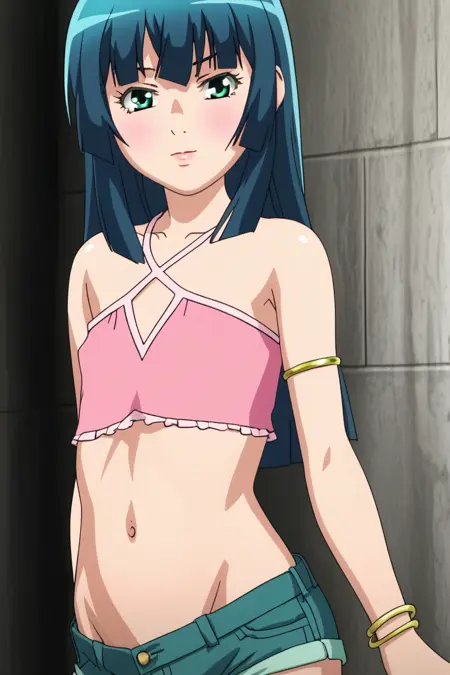 pink top, denim shorts, arm ring, bare shoulders