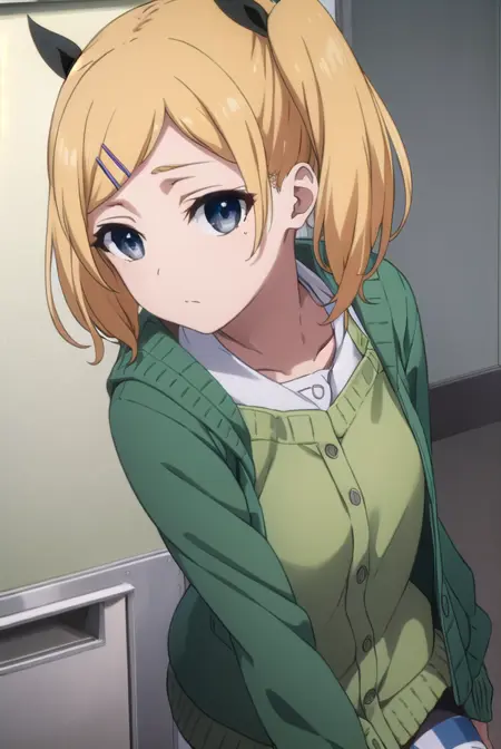 erika yano,短发,金发,发饰,双马尾,发夹,痣,(灰眼睛:1.3),眼下痣,短双马尾,丝带,发带,