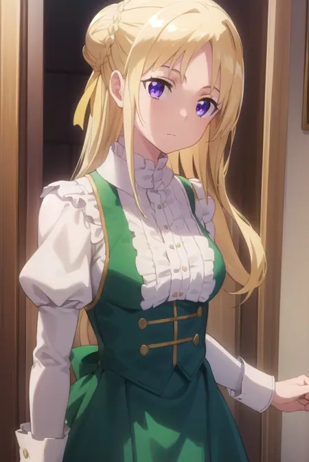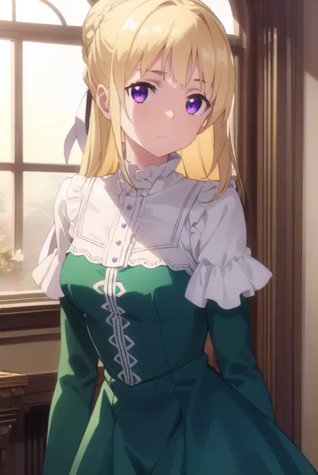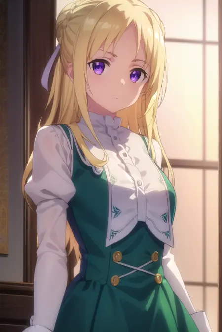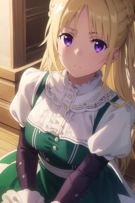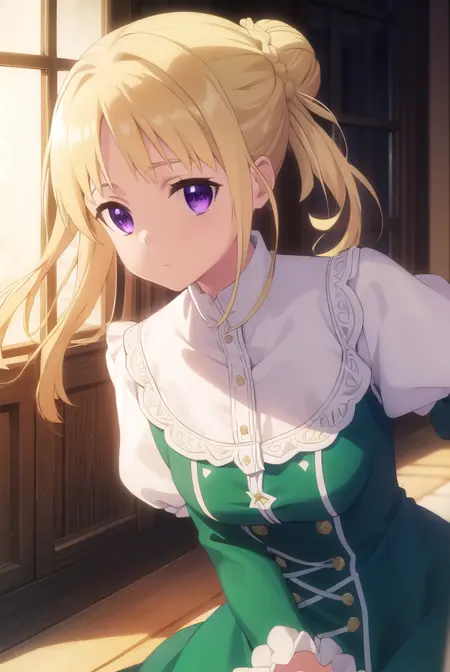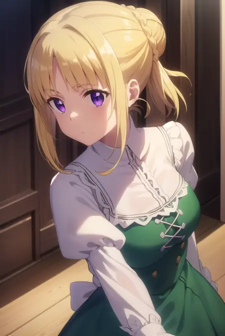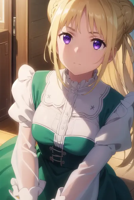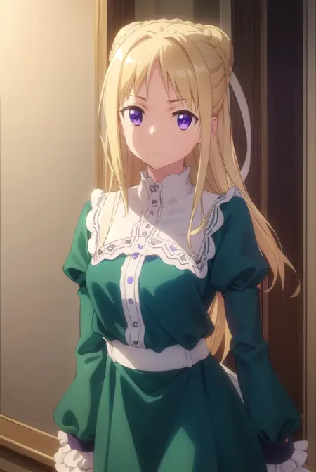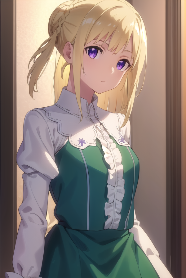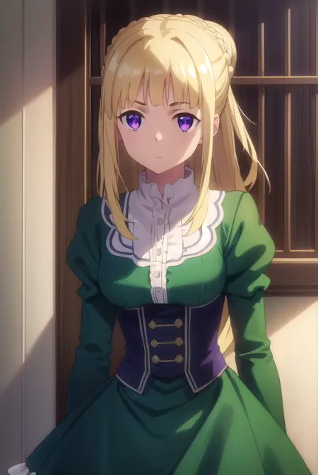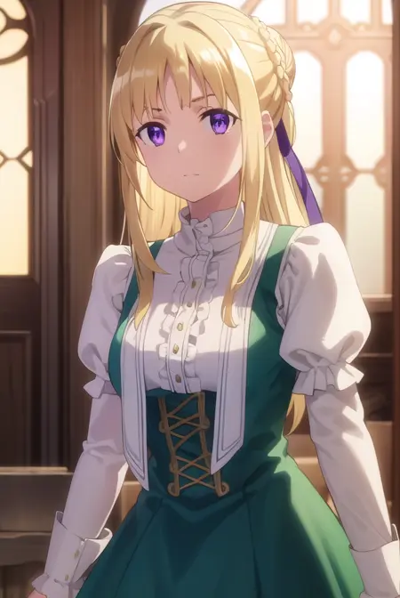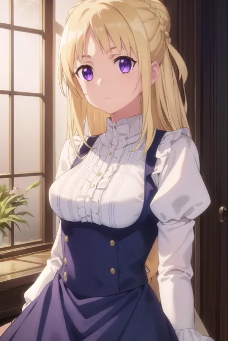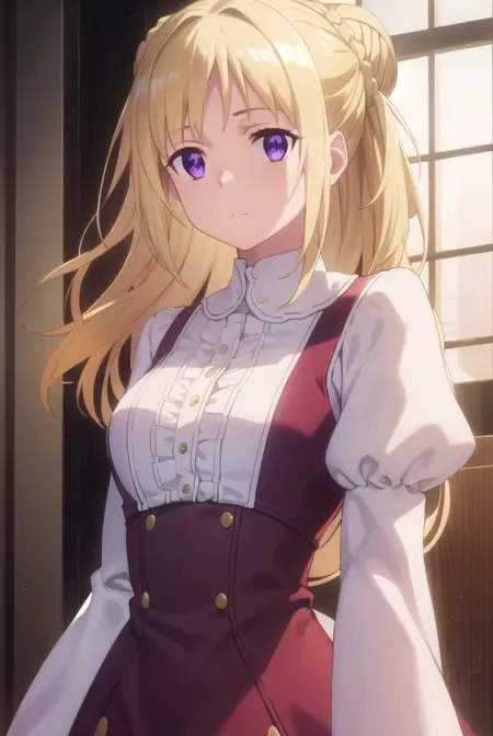 ortfine fredericka von eylstadt, long hair, blonde hair, (purple eyes:1.1), braid, hair bun, single hair bun,
