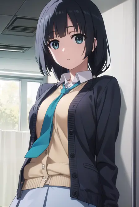 치마, 교복, 넥타이, 카디건, 셔츠, 회색 셔츠, 검은 치마, 노란 카디건,