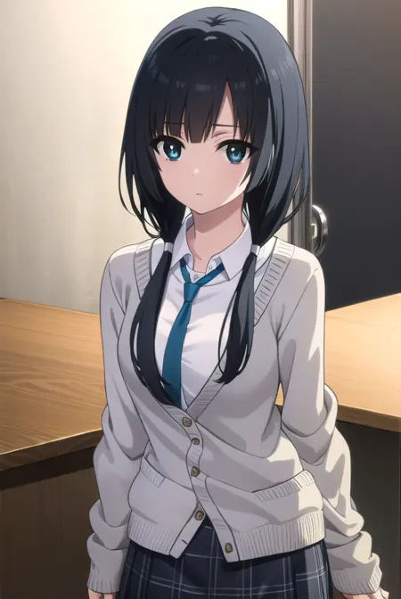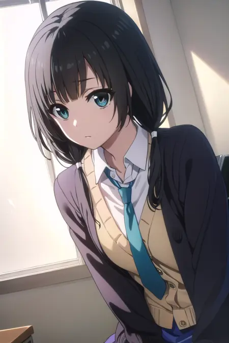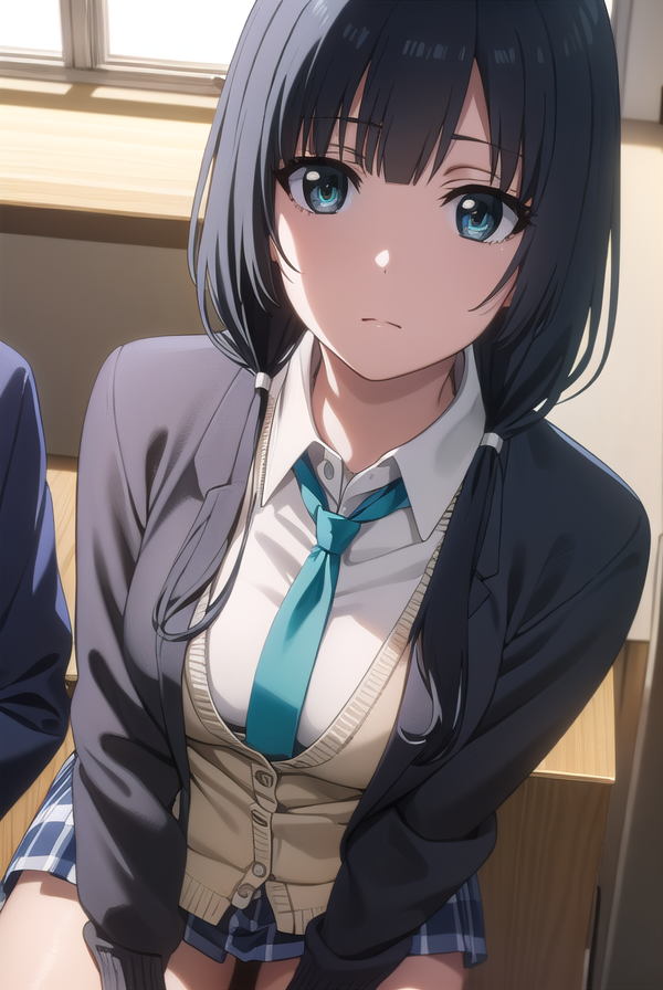 ema yasuhara, 긴 머리, 검은 머리, 트윈테일, (검은 눈:1.3), 낮은 트윈테일,