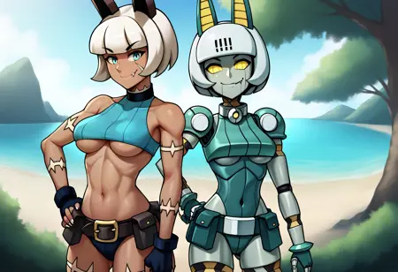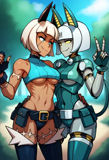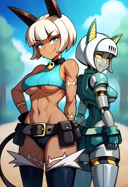 Two characters Ms. Fortune and Robo-Fortune from Skullgirls (2D fighting game)