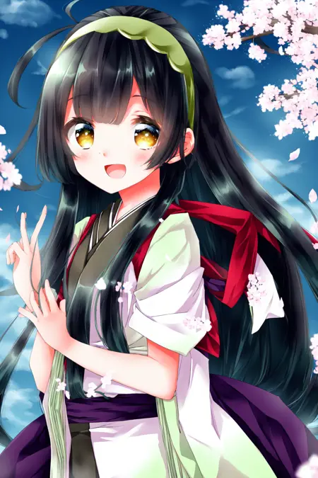 touhoku_zunko, green hair, ahoge, hairband, yellow eyes, japanese clothes, tasuki,