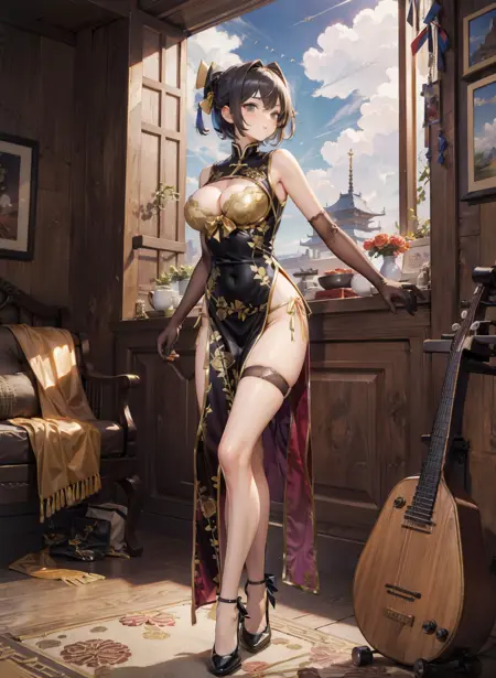 1girl, jinlian_china_dress, dress, chinese clothes, china dress, gloves, elbow gloves, cleavage, cleavage cutout, clothing cutout, high heels, black dress, black gloves, side slit, black footwear, bare shoulders, thigh strap, breasts out, nipple, no bra, no panties,