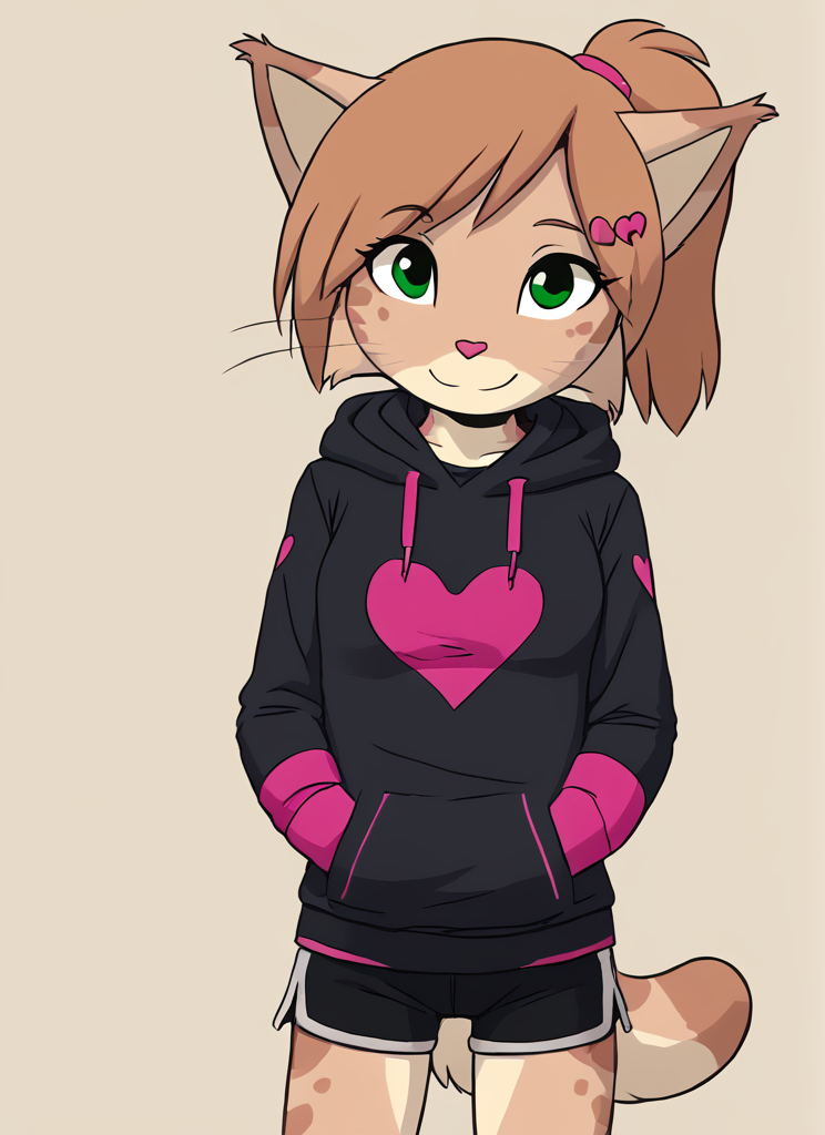 1girl ,amcs , Spots on the body , green eyes, brown skin ,ponytail, furry , furry female ,solo ,pink cat nose ,brown hair ,fringe ,