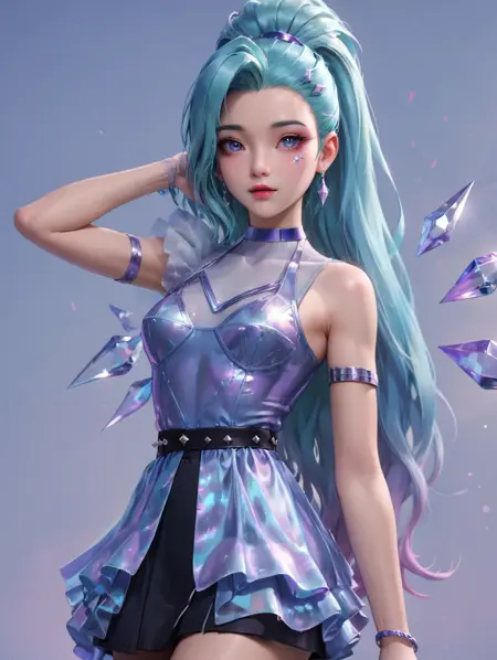 - 1girl, seraphinekda, blue hair ponytail, ((single hair bangs)), ((official k/da_(league_of_legends))), ((original k/da seraphine dress)),