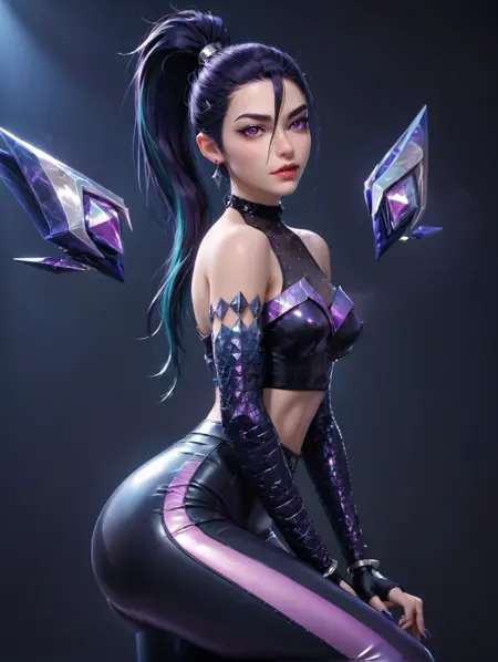 - 1girl, kaisakda, purple hair, ((long haired ponytail)), ((official k/da_(league_of_legends))), ((original k/da kaisa outfit)),