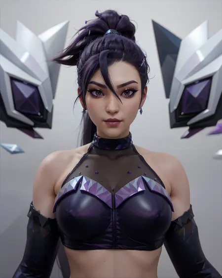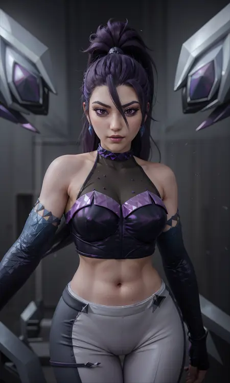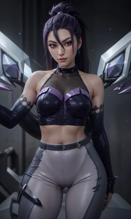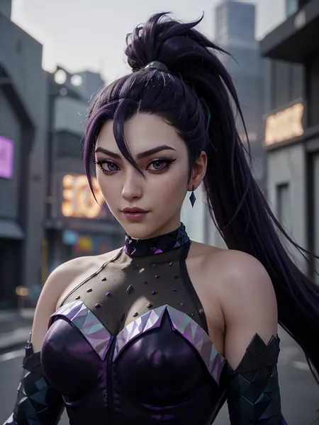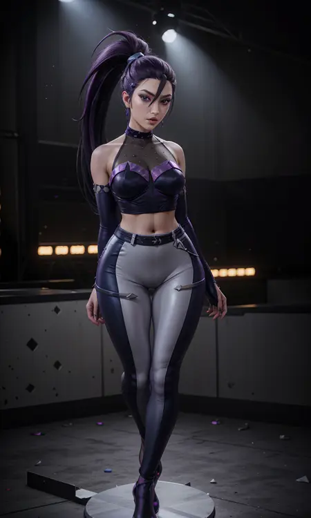 - 1girl, kaisakda, purple hair, ((long haired ponytail)), ((official k/da_(league_of_legends))), ((original k/da kaisa outfit)),