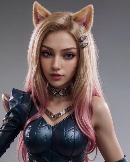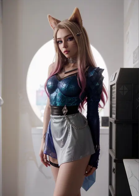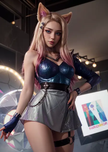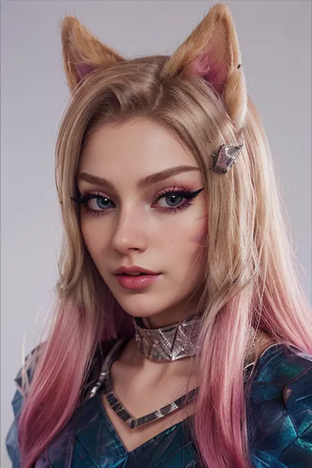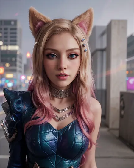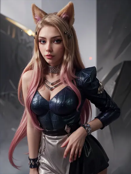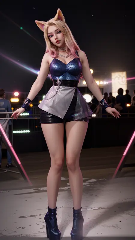 - 1girl, ahrikda, fox ears, blonde-pink hair, ((official k/da_(league_of_legends))), ((original k/da ahri dress)),