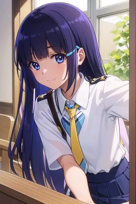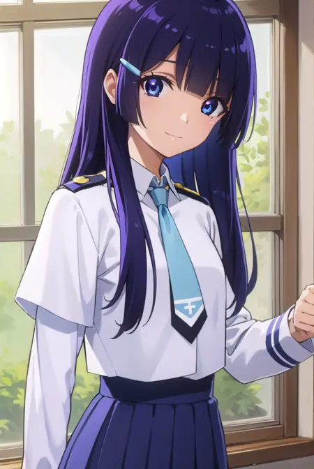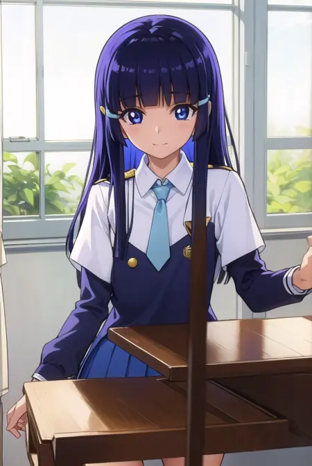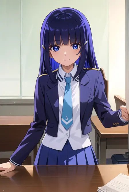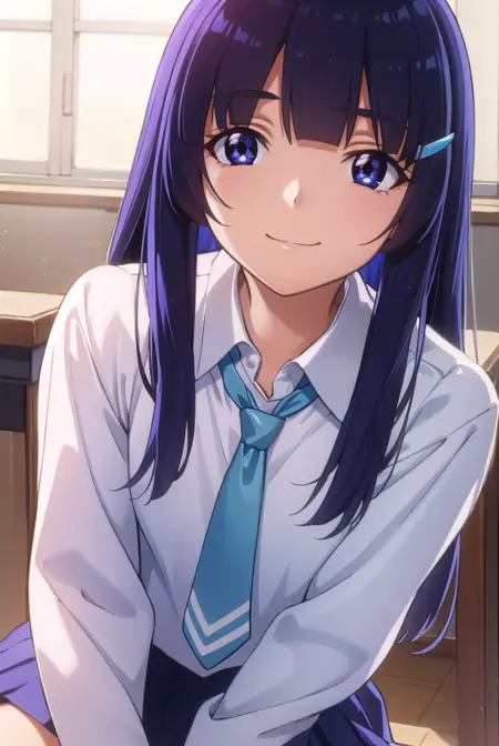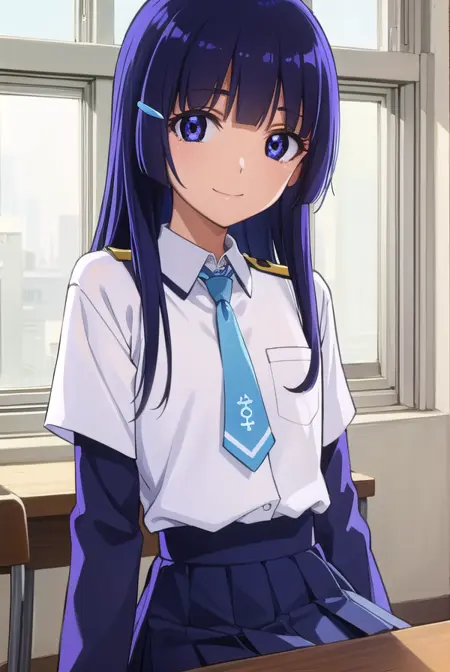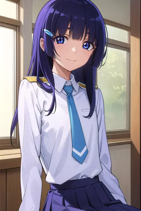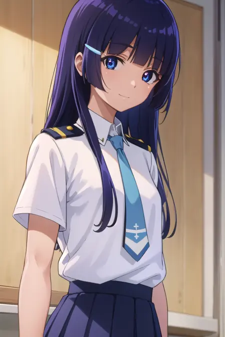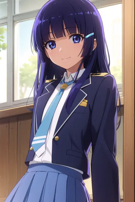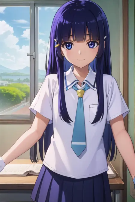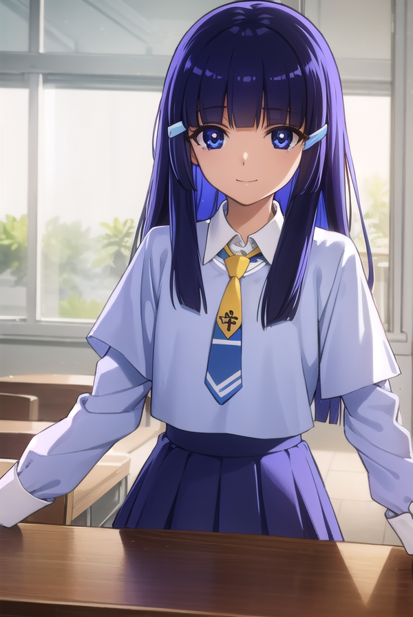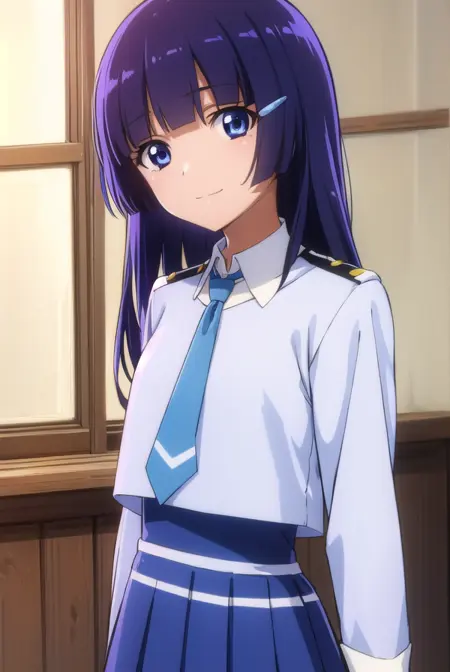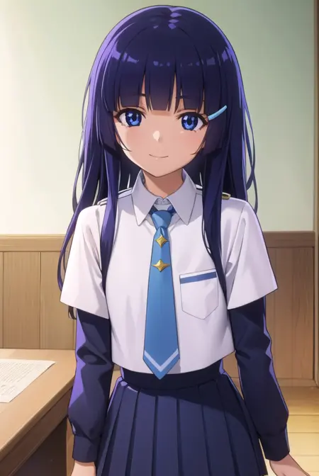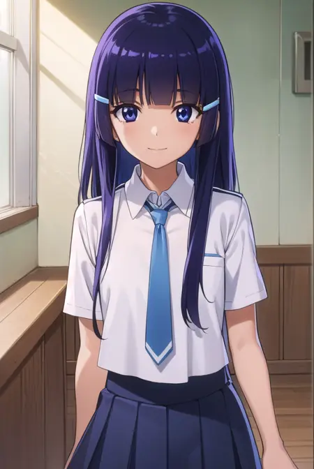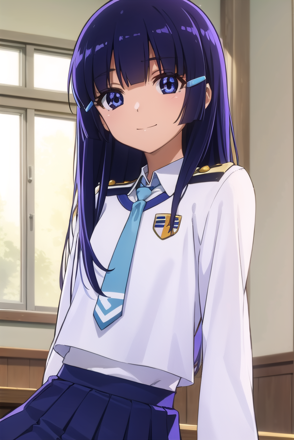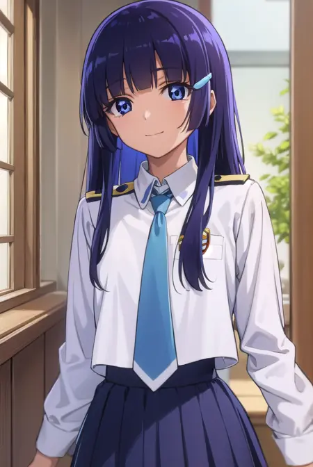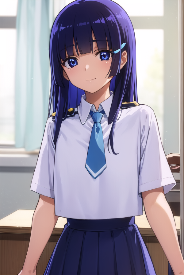 reika aoki, long hair, blue eyes, hair ornament, blue hair, hairclip, hime cut, bangs, blunt bangs,