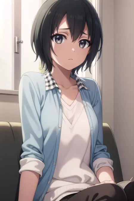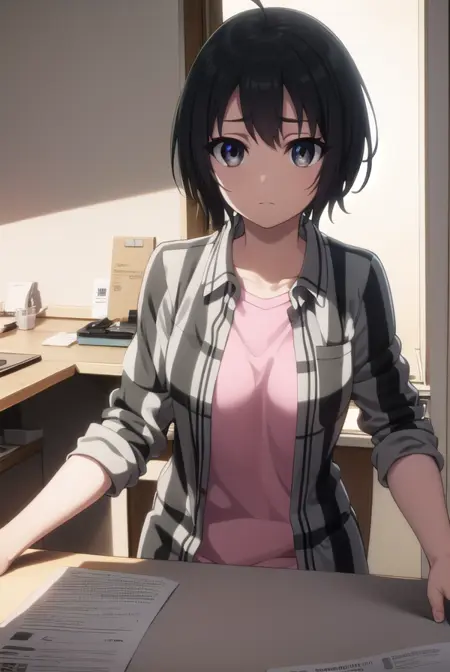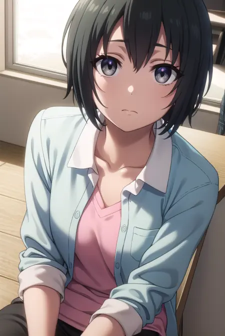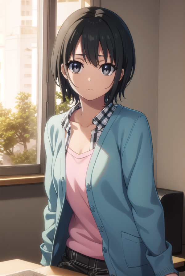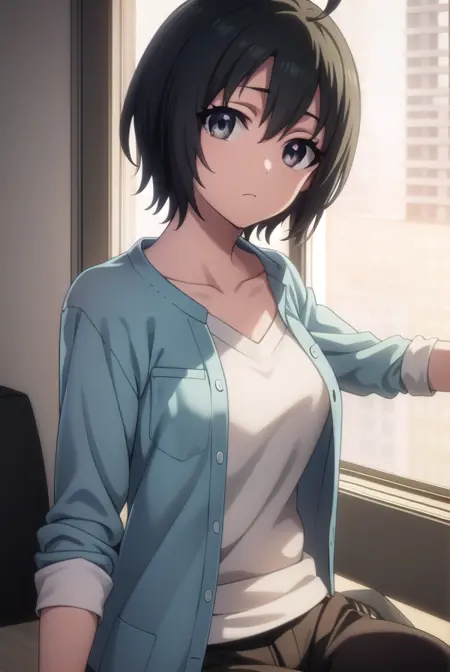 misa toudou, 단발, 검은 머리, ahoge, (검은 눈:1.3),