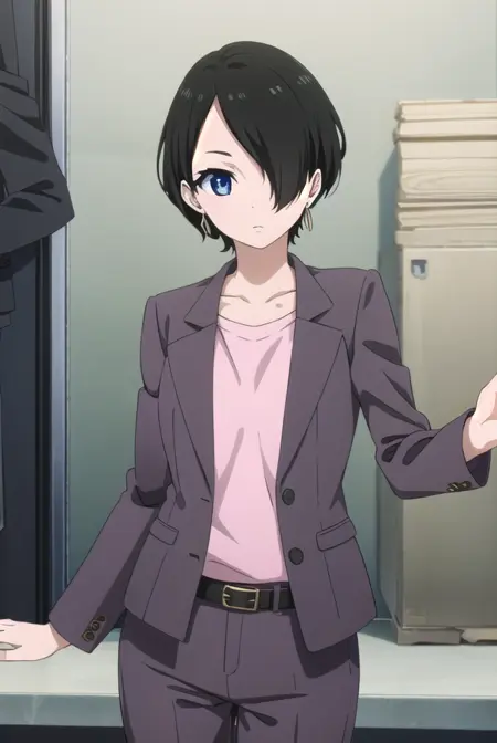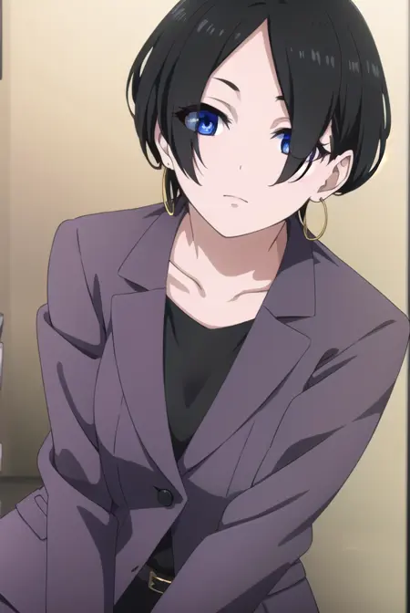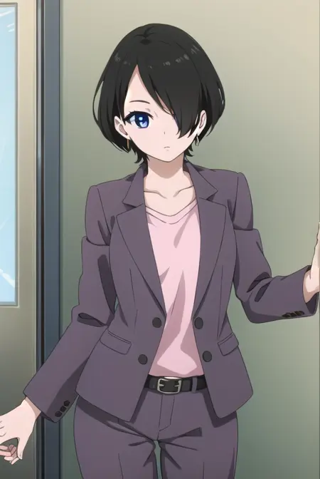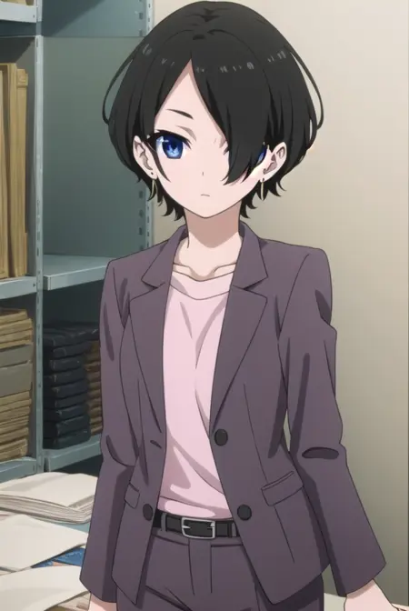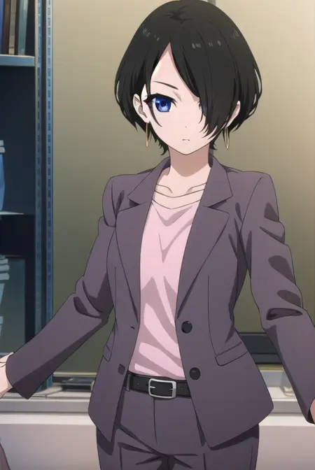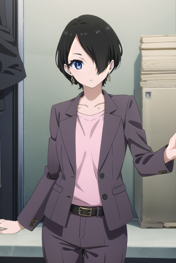 yuka okitsu, short hair, black hair, (hair over one eye:1.5), blue eyes,