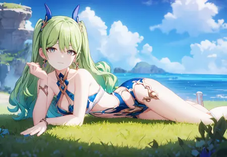 如果使用 V2 版本,触发词为: ph_mobius, 1girl, solo, long hair, green hair, bangs, green eyes, bare shoulders, jewelry, breasts, earrings, cleavage, sleeveless, sleeveless dress, dress, single earring, hair between eyes, wavy hair, grey eyes, swimsuit, hair ornament, small breasts
