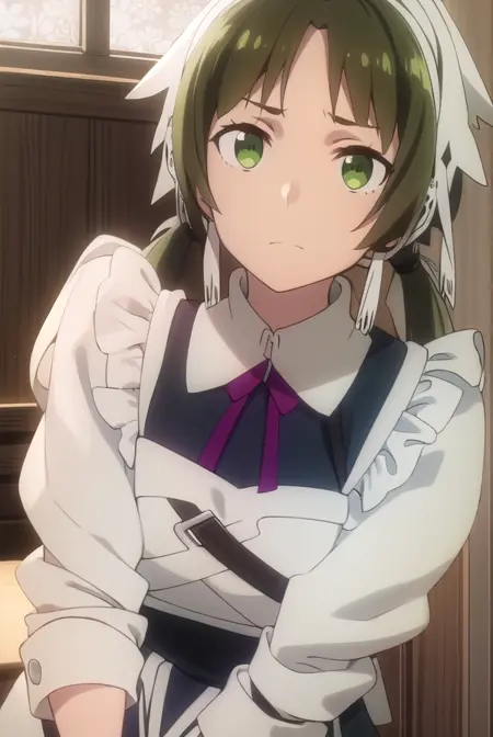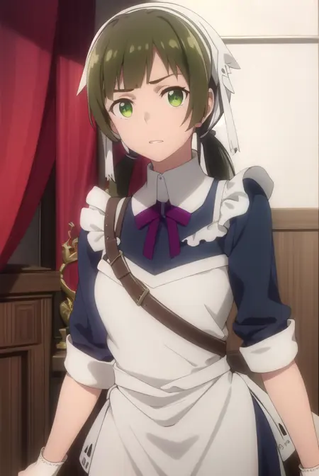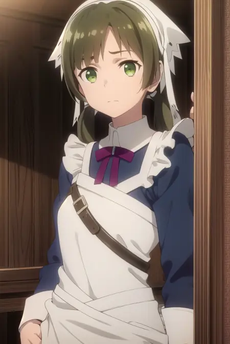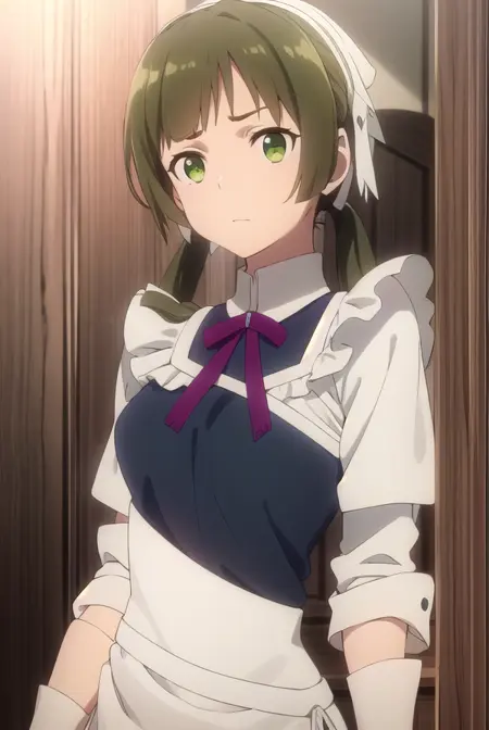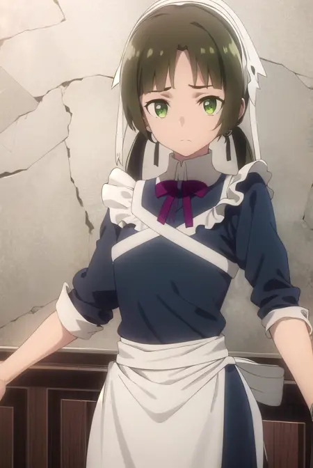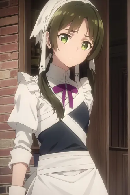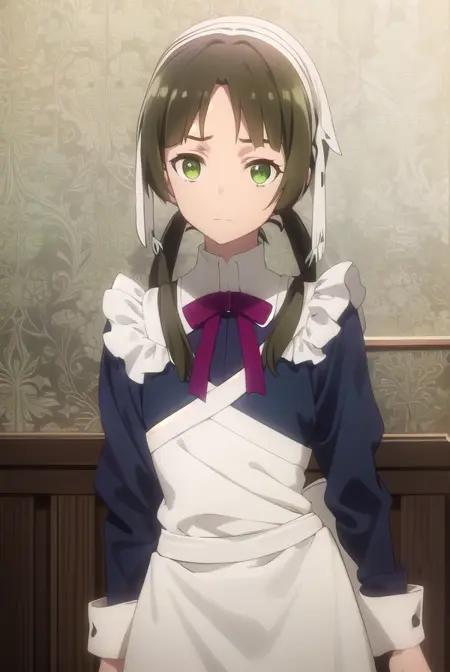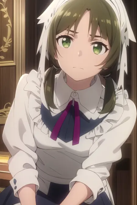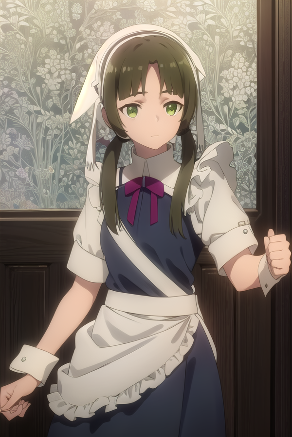 lotte, brown hair, twintails, (green eyes:1.3), low twintails,