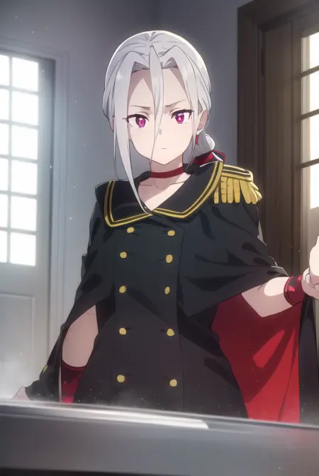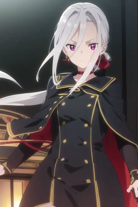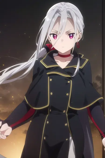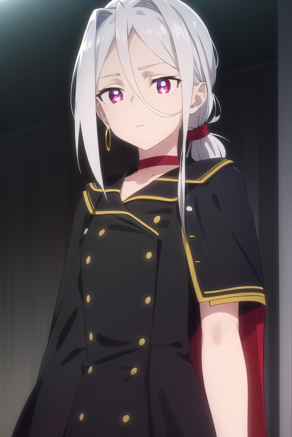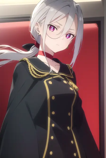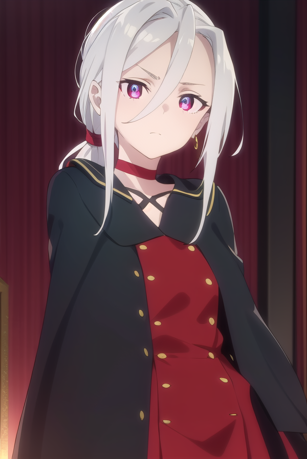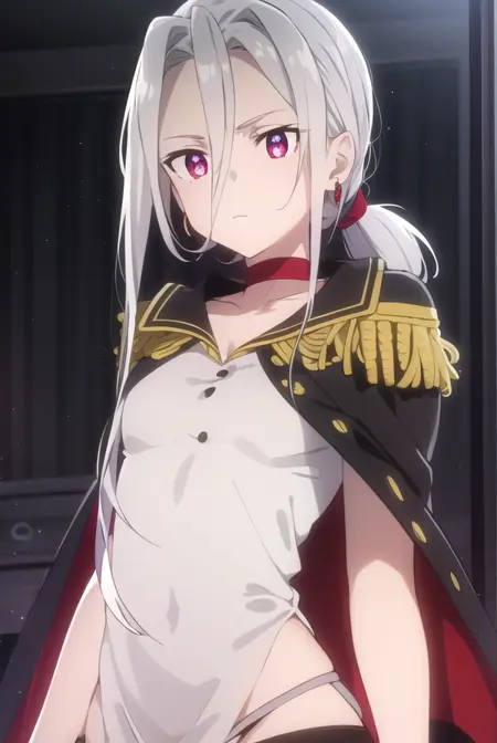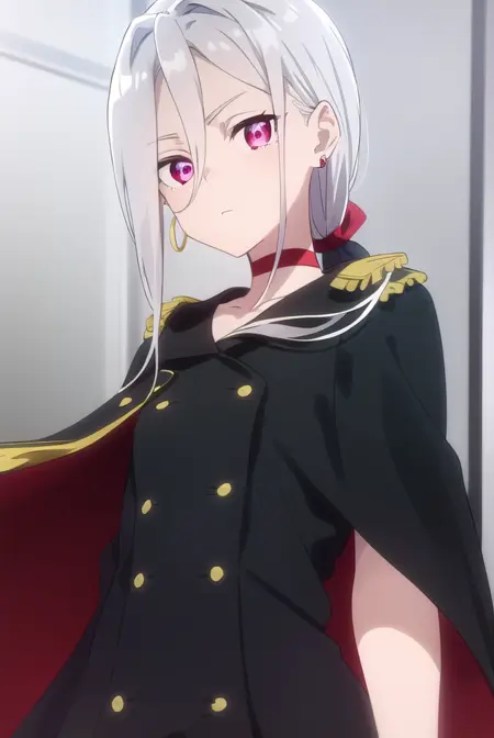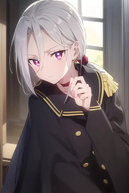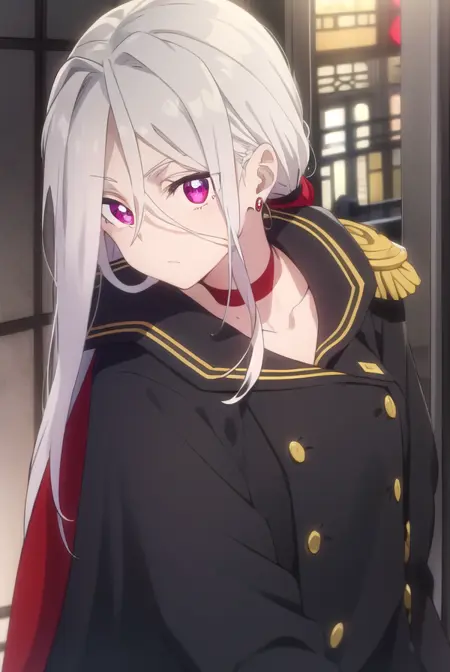 jewelry, earrings, choker, cape, uniform, military, military uniform, buttons, epaulettes, red choker,