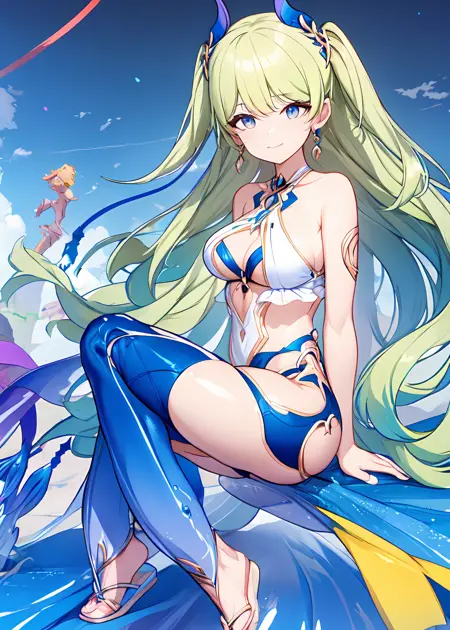 If you use V2, the Trigger words are: ph_mobius, 1girl, solo, long hair, green hair, bangs, green eyes, bare shoulders, jewelry, breasts, earrings, cleavage, sleeveless, sleeveless dress, dress, single earring, hair between eyes, wavy hair, grey eyes, swimsuit, hair ornament, small breasts