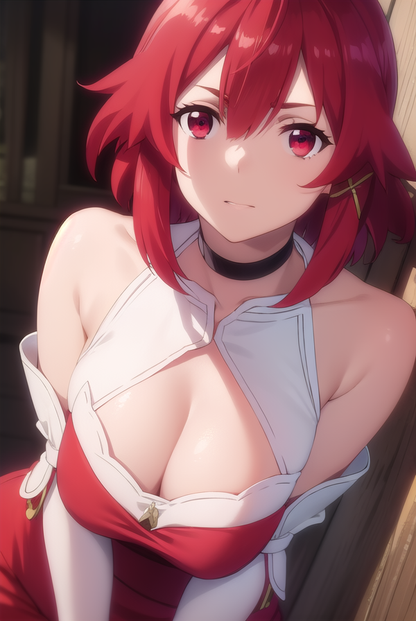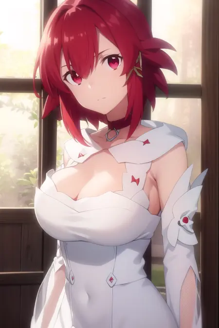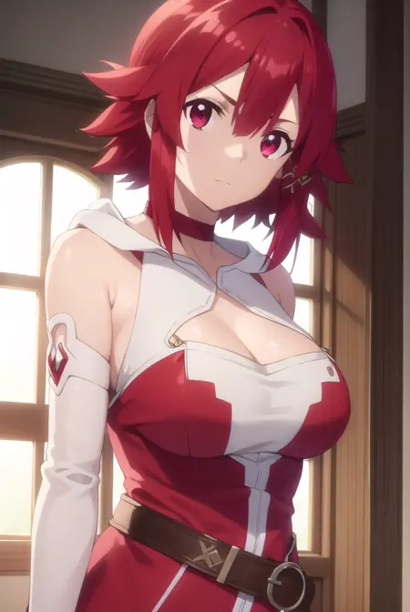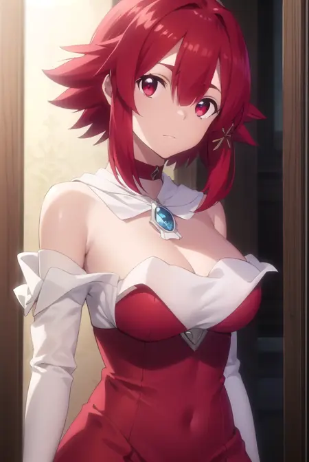 izetta, short hair, (red eyes:1.3), red hair, hair between eyes, hair ornament,
