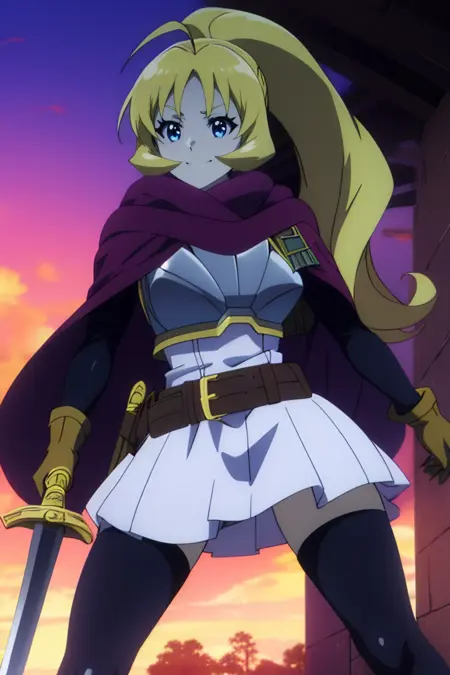 outfit trigger: cape, gloves, sword, scarf, belt, armor, skirt, thighhighs, sunset