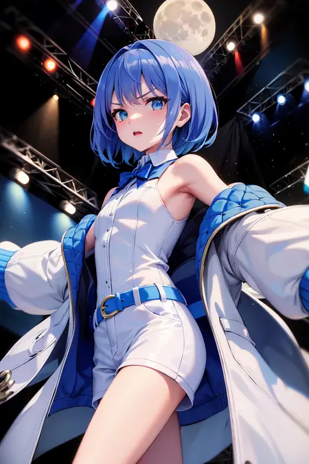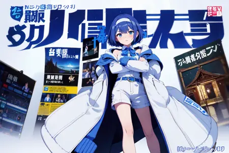 (blue collared with jacket:1.3),(blue collared with coat:1.3),blue jacket, blue belt, white shorts,
