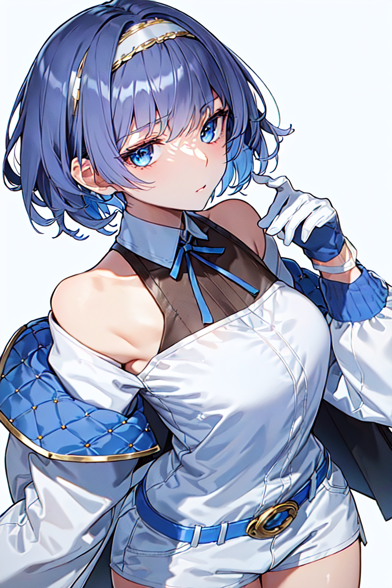 lora:SuzukiTsudumi_AI_V01:0.8suzukitsudumi, blue hair, (white with hair band), bangs, hair bow, hair intakes, short hair, flat chest,