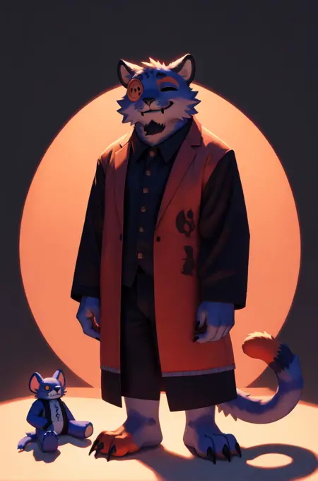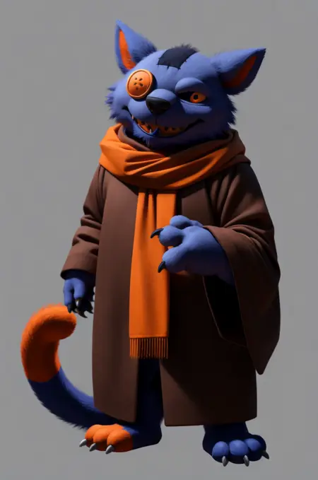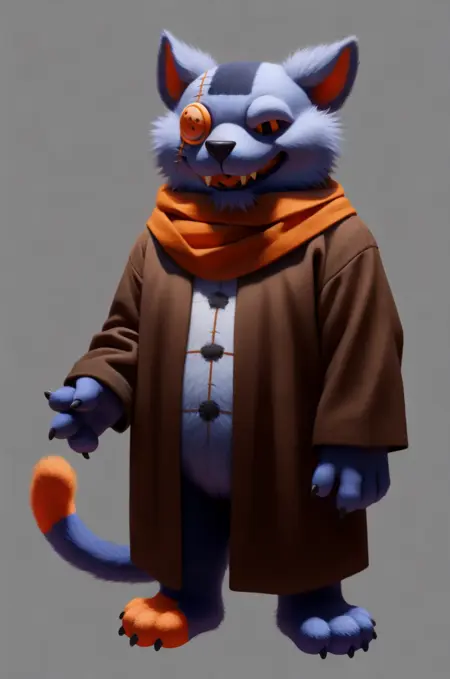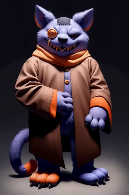 Suggested additional tags for prompting include: asymmetrical, mismatched, felid, feline, anthro, one eyed, one orange eye, one black eye, seam \(sewing\), stitch \(sewing\), patch \(fabric\), sewn mouth