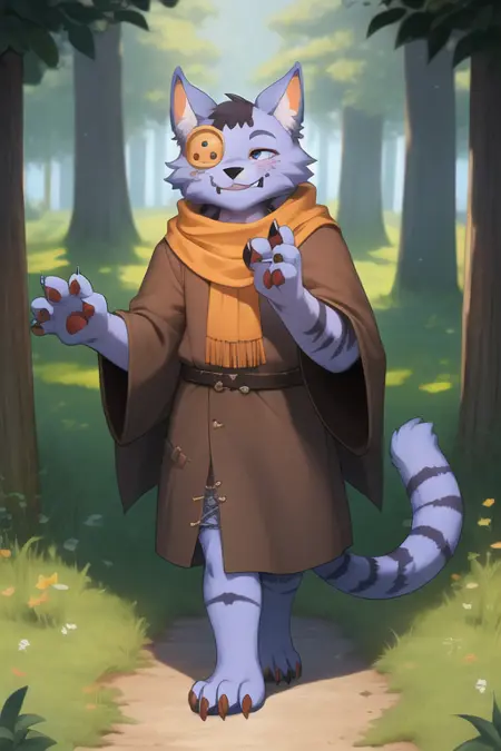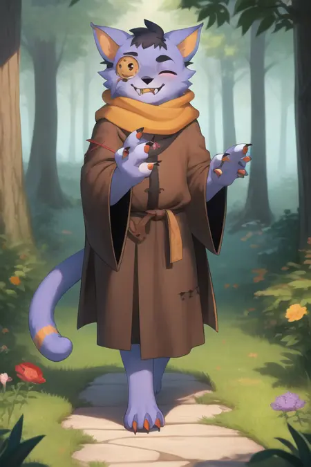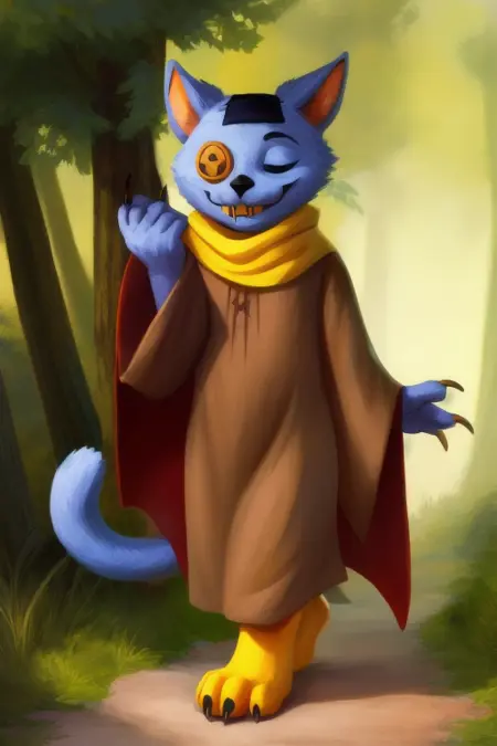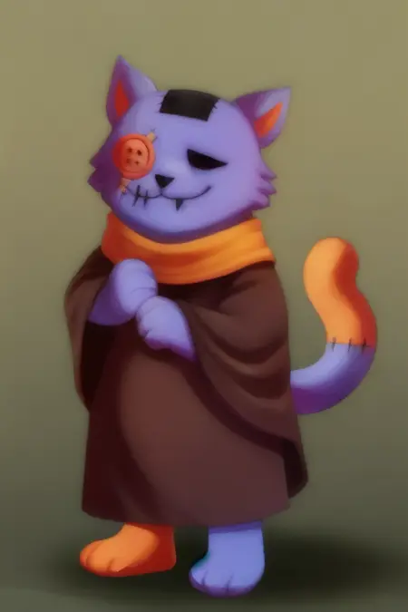 Suggested additional tags for prompting include: asymmetrical, mismatched, felid, feline, anthro, one eyed, one orange eye, one black eye, seam \(sewing\), stitch \(sewing\), patch \(fabric\), sewn mouth