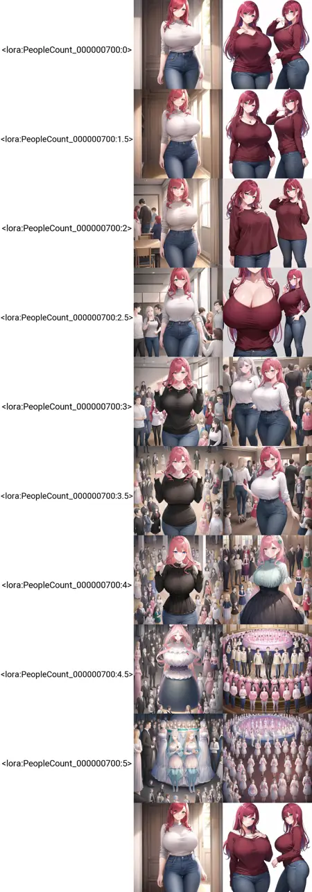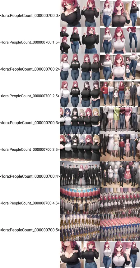 Warning3: seem to need wider images to work, using full_body, wide_shot and standing also help as they make the characters smaller leaving more room for other characters. The idea was a leco to control the amount of people. Didn't work. The amount of people in an image is mostly dictated by the resolution of an image, thus wide screen images give more people. What it does do is either a single person or try to cram as many people as possible in the available space. It is a nice effect though. The negative is also useful if you want a scenic wide screen image without extra people randomly appearing while the positive tries to add more people.