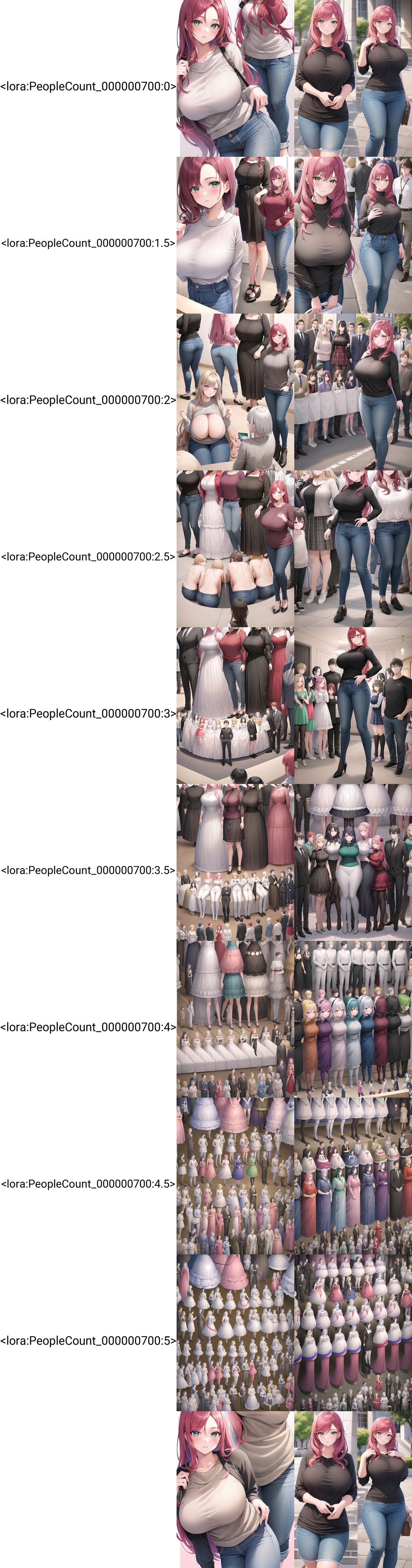 LECOs are manipulated by their weight and normally need no triggers to use it, change their weight like this lora:PeopleCount:-1 to make sure you only get a single character or lora:PeopleCount:1 to make try to cram as much people as possible in the available space, setting it to zero having very little effect on the prompts. Remember you can go further than -1 or 1!