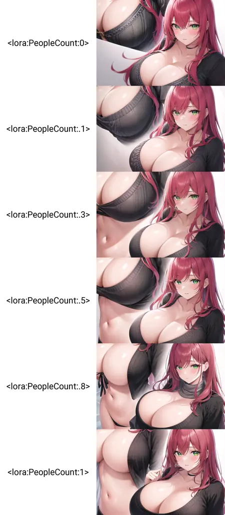 LECOs are manipulated by their weight and normally need no triggers to use it, change their weight like this lora:PeopleCount:-1 to make sure you only get a single character or lora:PeopleCount:1 to make try to cram as much people as possible in the available space, setting it to zero having very little effect on the prompts. Remember you can go further than -1 or 1!