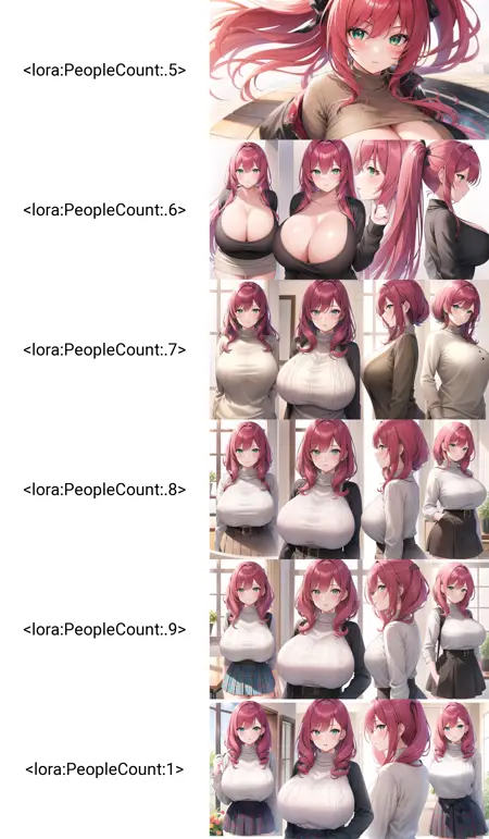 Warning3: seem to need wider images to work, using full_body, wide_shot and standing also help as they make the characters smaller leaving more room for other characters. The idea was a leco to control the amount of people. Didn't work. The amount of people in an image is mostly dictated by the resolution of an image, thus wide screen images give more people. What it does do is either a single person or try to cram as many people as possible in the available space. It is a nice effect though. The negative is also useful if you want a scenic wide screen image without extra people randomly appearing while the positive tries to add more people.