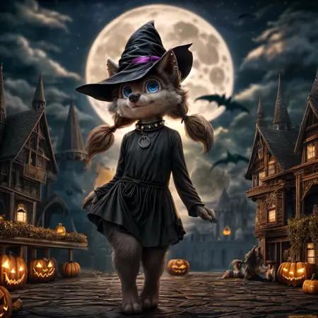 也可通过将“female, blue eyes”替换为“male furry, yellow eyes”来生成她的兄弟们。