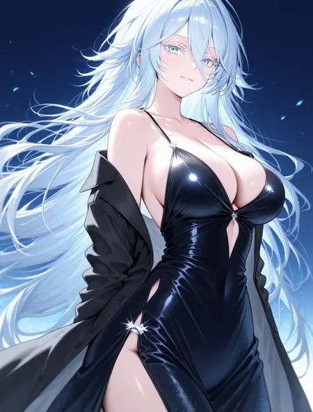 天幕危机(skyfall agent):sovetsky_soyuz_\(azur_lane\),long hair,white hair, black dress, thigh_holster,pelvic_curtain, long dress, collarbone,