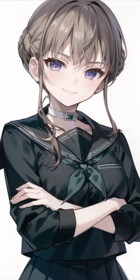 추천 프롬프트: 만카 네무, 갈색 머리, 보라색 눈, 평평한 앞머리, 학교 복장, 네크리프, 머리 뭉치, 측두부 머리카락, 긴 머리