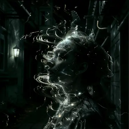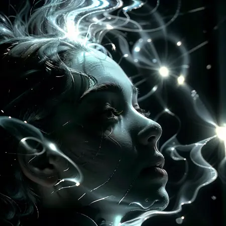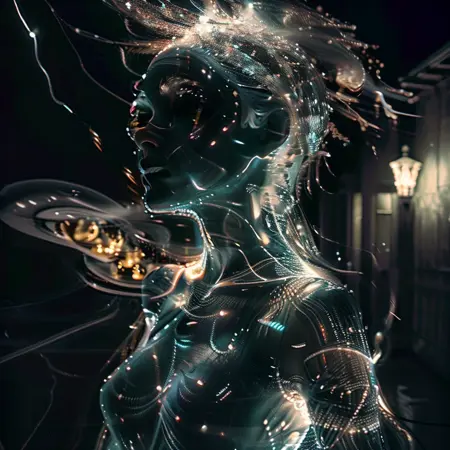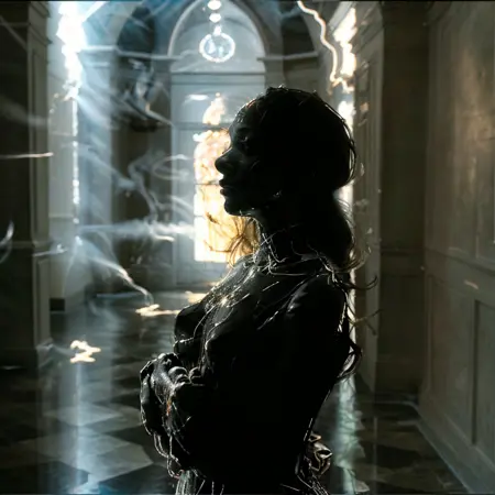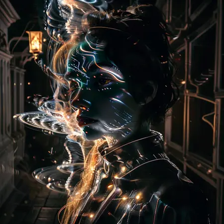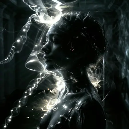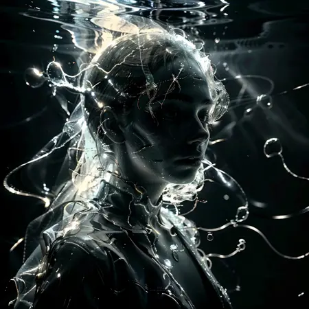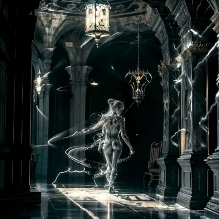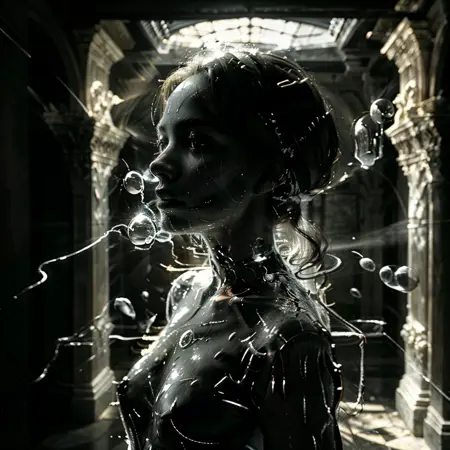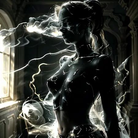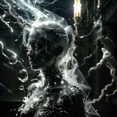 1boy, 1girl, air bubble, black background, blue eyes, breasts, bubble, closed eyes, closeup, collarbone, door, dress, electricity, encased, facial hair, floating hair, from side, full body, glowing, indoors, lamp, light bursts, lightning, lips, long hair, navel, necklace, nipples, no humans, nude, outdoors, parted lips, ponytail, portrait, profile, realistic, shadefolk, short hair, silhouette, simple background, sitting, solo, teeth, top teeth only, topless, upper body, veil, very long hair, visual trails, walking, wavy hair, white hair, window,