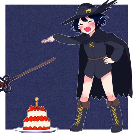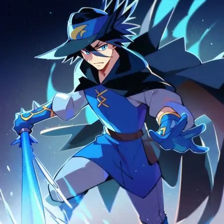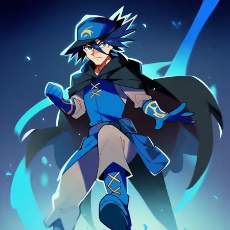 Hat, cape, black cape, tunic, long sleeves, pants, boots, belt, blue gloves