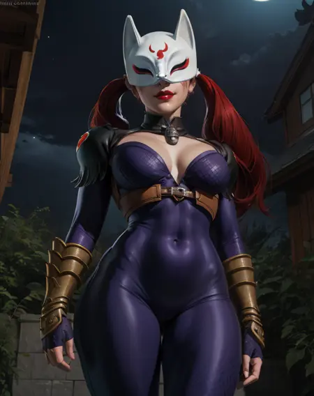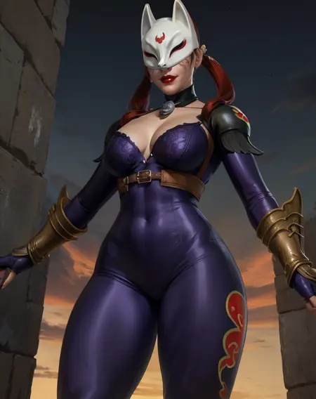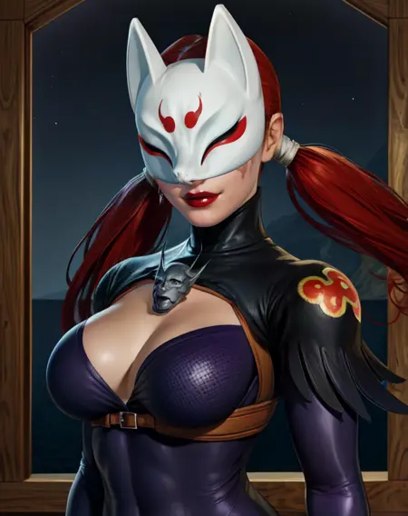 kunimitsu, red hair, twin tails, lipstick, - fox mask,
