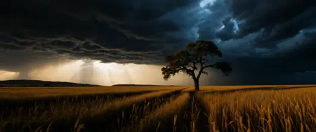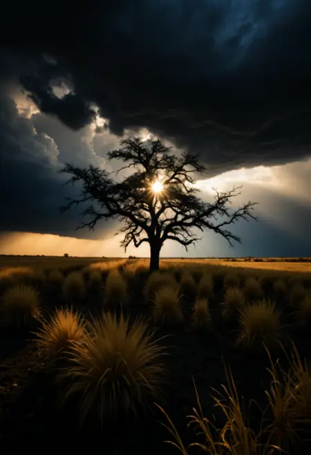A high-resolution, atmospheric photograph capturing a serene sunset over a mountainous landscape. The composition features a lone tree standing on a hillside, silhouetted against the warm, golden light of the setting sun. The sky is a gradient of soft oranges and yellows, blending into the horizon. Rays of sunlight stretch across the scene, creating long shadows and adding depth to the rolling hills. The overall mood is peaceful and contemplative, with a harmonious balance between light and shadow. The exposure is perfectly balanced, emphasizing the natural beauty and tranquility of the landscape.