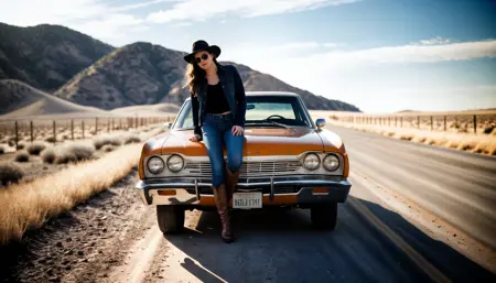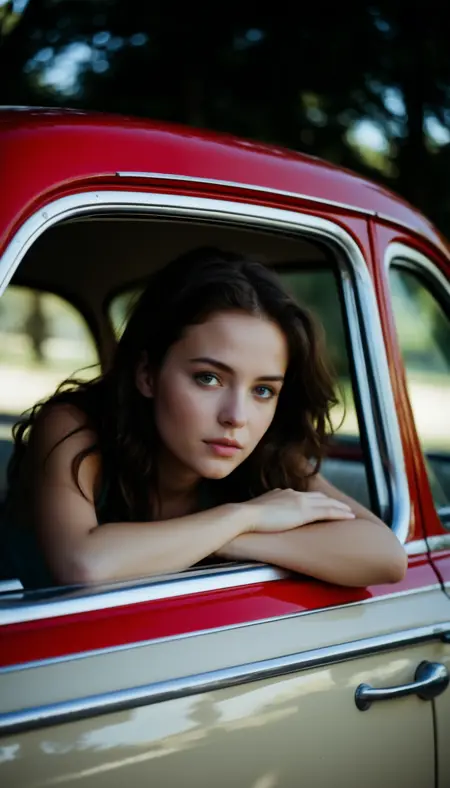 High-resolution photograph, young woman, leaning out of vintage red car window, arms crossed on door, head tilted, calm contemplative expression, curious gaze, engaging connection, framed upper body, smooth vintage vehicle lines, nostalgic feel, softly blurred background, serene reflective mood, muted warm tones, timeless quality.