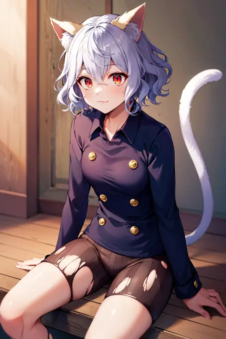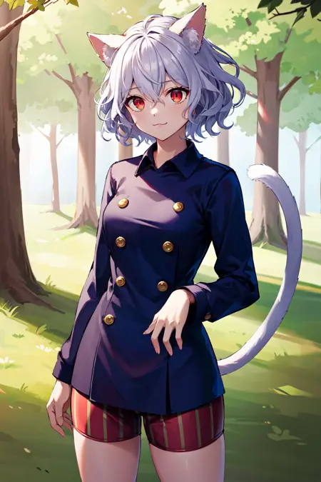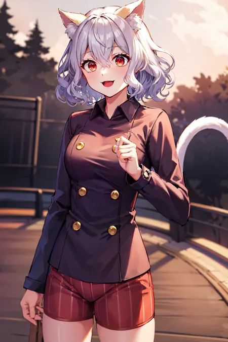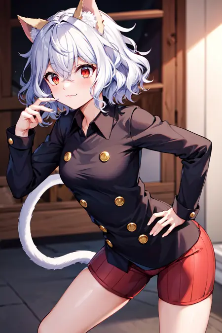 neferpitou1, cat ears, (cat tail:0.8), solo, short hair, red eyes, long sleeves, hair between eyes, :3, curly hair, striped, cat girl, buttons, striped shorts