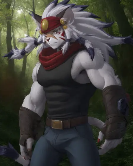 Trigger with "belugadamiens", and may get better results by prompting for "feline, male, grey fur" or similar