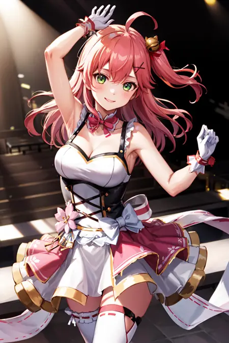 miko4, 1girl, hololive idol uniform, sakura miko, idol clothes, green eyes, ahoge, pink hair, solo, x hair ornament, hairclip, single thighhigh, white gloves, long hair, floral print, bell, hair bell, cleavage, pink thighhighs, one side up