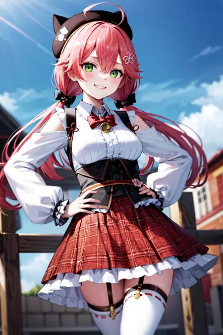 miko2, sakura miko, 1girl, solo, green eyes, long hair, ahoge, black headwear, white shirt, black thighhighs, pink hair, red skirt, plaid skirt, garter straps, hairclip, animal hat, low twintails, neck bell, breasts, long sleeves, black bow, underbust