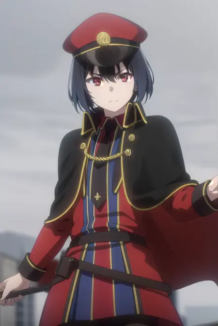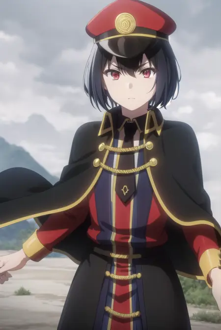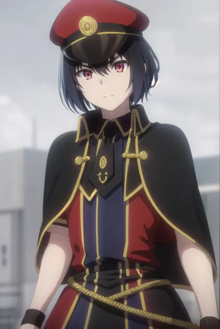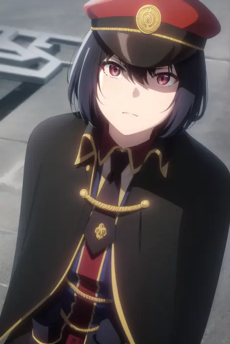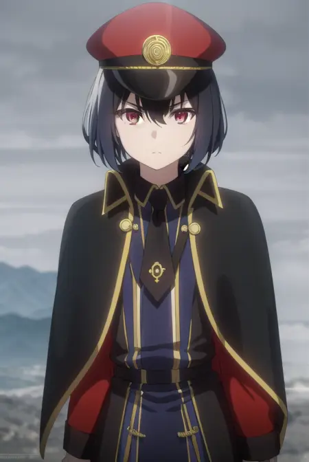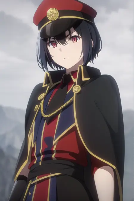 hat, pantyhose, necktie, cape, uniform, black pantyhose, military, military uniform, peaked cap, black necktie, military hat, black cape,