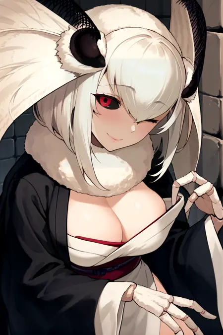 Original character by solopipb, starring in adult doujin trilogy named [ 英訳 / Shiragasane / Layers of White ]. This trilogy features a monster girl whose motif is of a silk cocoon moth with an alluring aura that seems to trap her victims in their own head.