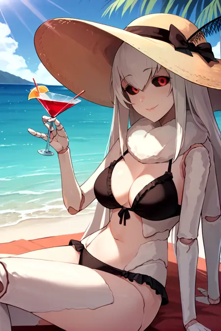 - mashiro, white hair, medium hair, red eyes, black sclera, 4 arms, 3 fingers, joints