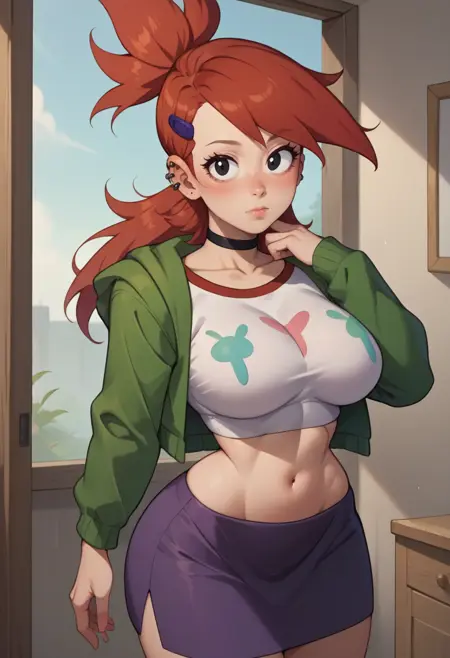 Character prompt: frankieXL, 1girl, solo, breasts, looking at viewer, blush, skirt, large breasts, shirt, hair ornament, long sleeves, navel, jewelry, jacket, white shirt, ponytail, red hair, earrings, choker, hairclip, midriff, black eyes, crop top, black choker, piercing, ear piercing, purple skirt, green jacket, cropped shirt,