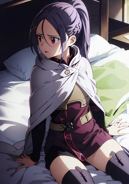 short_dress,black_shorts, cape,, miniskirt , breast plate, purple clothes, belt,