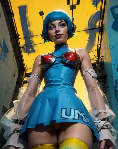 헤드셋, 안테나, - 파란 터틀넥 또는 드레스, - 분리형 소매 또는 풍선 소매 또는 투명 소매 또는 민소매, -- 줄무늬 허벅지 길이 양말, 스케이트,