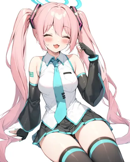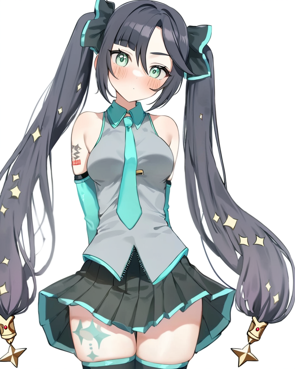 角色名(name), solo, twintails, hatsune_miku_\(cosplay\),cosplay,hair_ribbon,necktie,full body